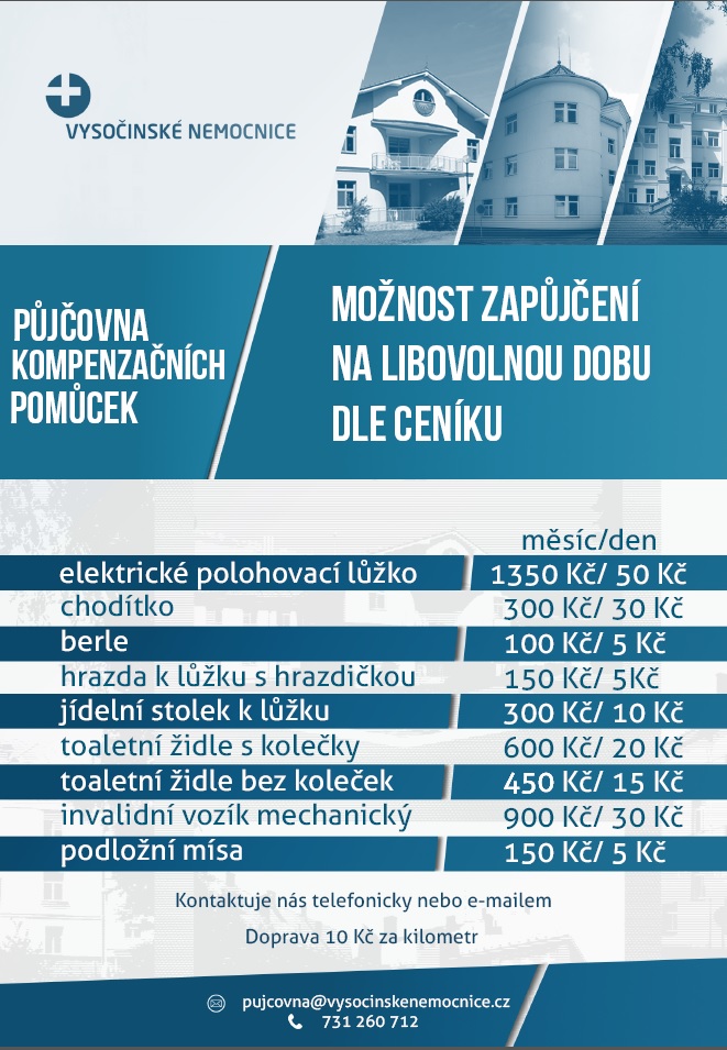 Vysočinské nemocnice od 1.12.2016 nabízí služby půjčovny kompenzačních pomůcek. Případné dotazy týkající se této služby zajišťujeme na mobilním čísle 731 260 712 a nebo na emailu: pujcovna@vysocinskenemocnice.cz .