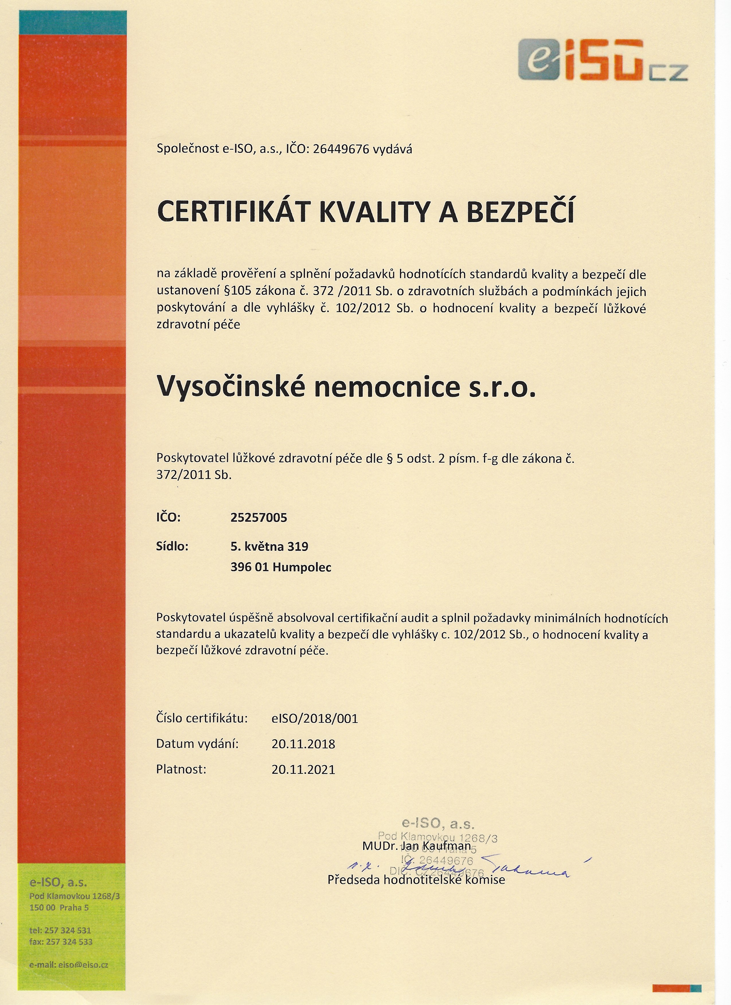 Dne 27. listopadu 2019 proběhlo ve Vysočinských nemocnicích s.r.o. externí hodnocení společnosti e-ISO, a.s. Auditoři se zaměřili na respektování práv pacientů, optimální využití zdrojů, především na bezpečnou manipulaci s léčivem a se zdravotními prostředky, stravování pacientů, řízení rizik na jednotlivých odděleních, strategické plánování a kontakt s poskytovateli zdravotních služeb. Přísným auditem Vysočinské nemocnice s.r.o. prošly a obhájily udělení certifikátu kvality a bezpečí a to dle platného § 105 zákona č. 372/2011 Sb. o hodnocení kvality a bezpečí lůžkové péče. Vysočinské nemocnice opět prokázaly, že poskytují kvalitní a bezpečnou zdravotní péči splňující velmi náročné požadavky.