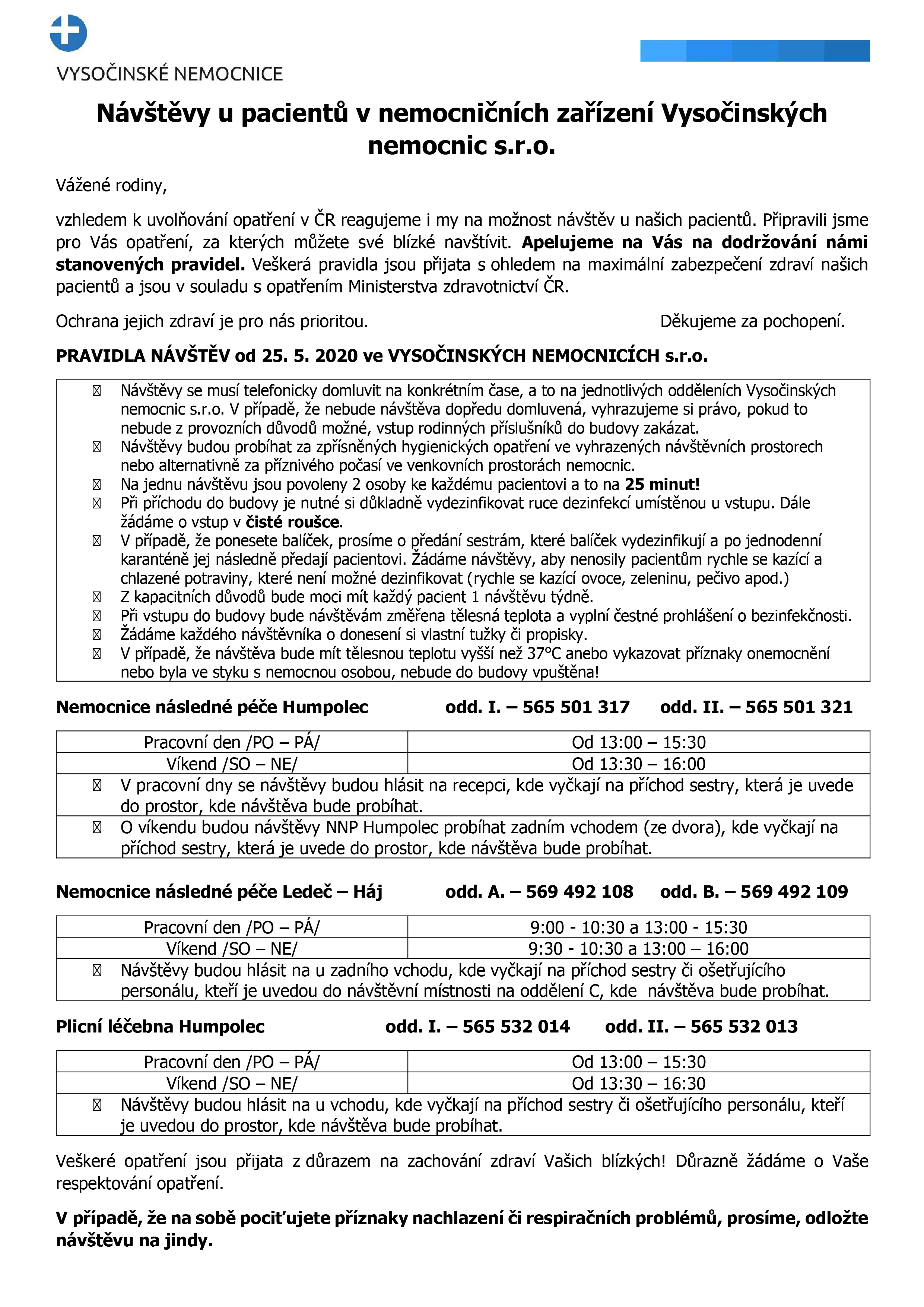 Veškeré informace k jednotlivým nemocnicím (pravidla návštěvy, kontaktní telefony a návštěvní hodiny) najdete na přiloženém informačním letáčku.