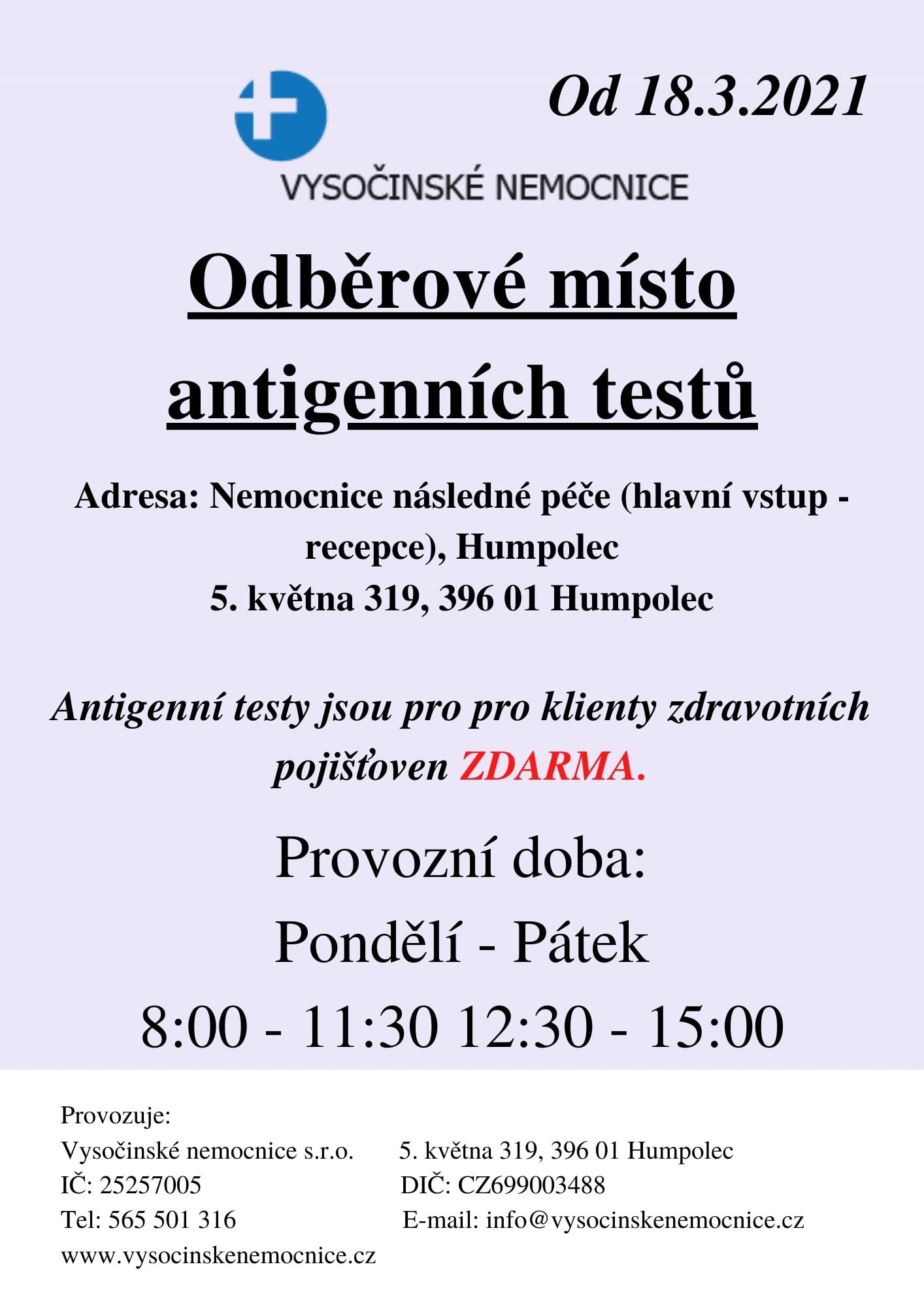 Od 18.3.2021 nabízíme odběr antigenním testem pro širokou veřejnost a to každý pracovní den (mimo státních svátků).