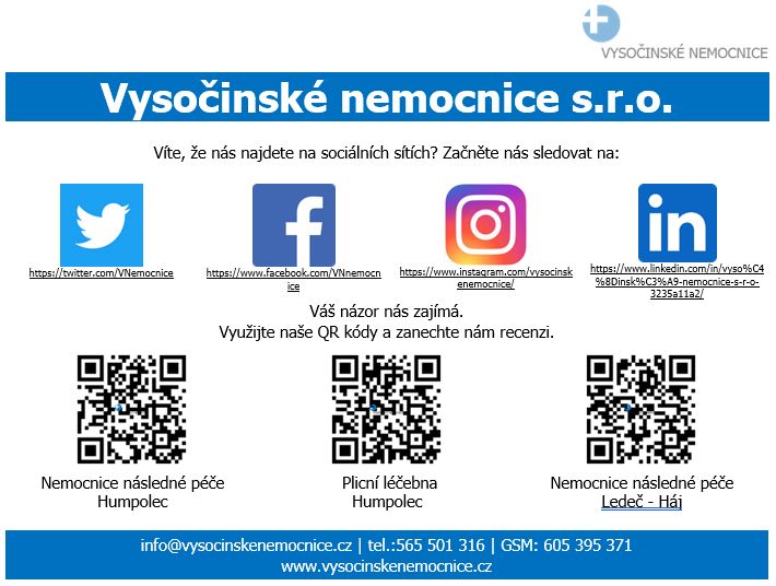 Navštivte naše stránky a začněte nás sledovat. Díky tomu Vám neunikne žádná novinka z našich Vysočinských nemocnic.