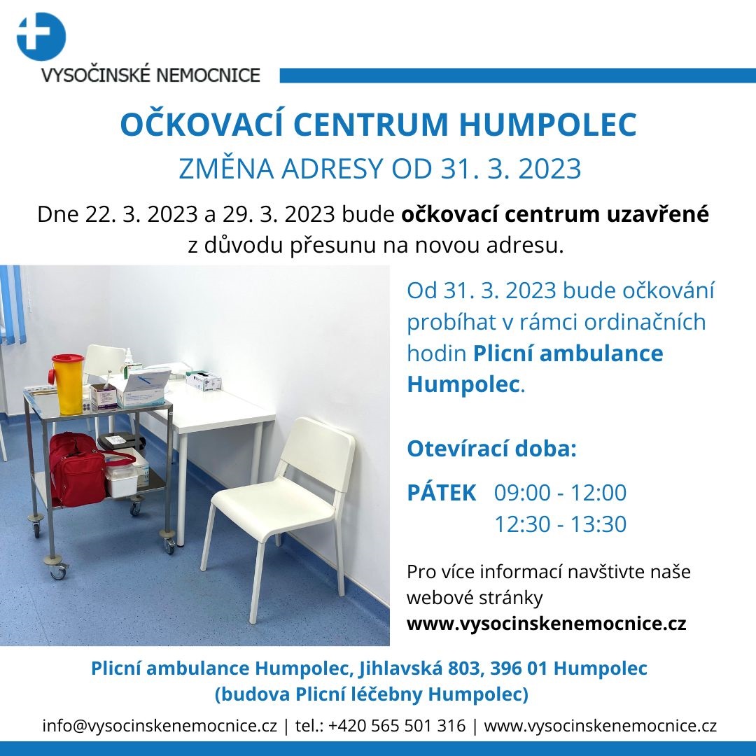 Očkovací centrum Humpolec - změna adresy od 31. 3. 2023