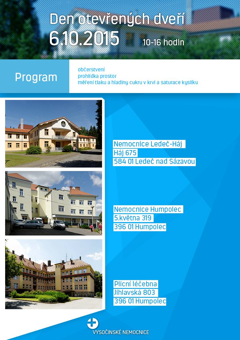 Dne 6.10.2015 od 10 do 16 hodin proběhne na všech pracovištích Vysočinských nemocnic den otevřených dveří. Srdečně zveme všechny zájemce na prohlídku prostor kde bude čekat malé občerstvení a měření tlaku a hladiny cukru v krvi a saturace kyslíku.